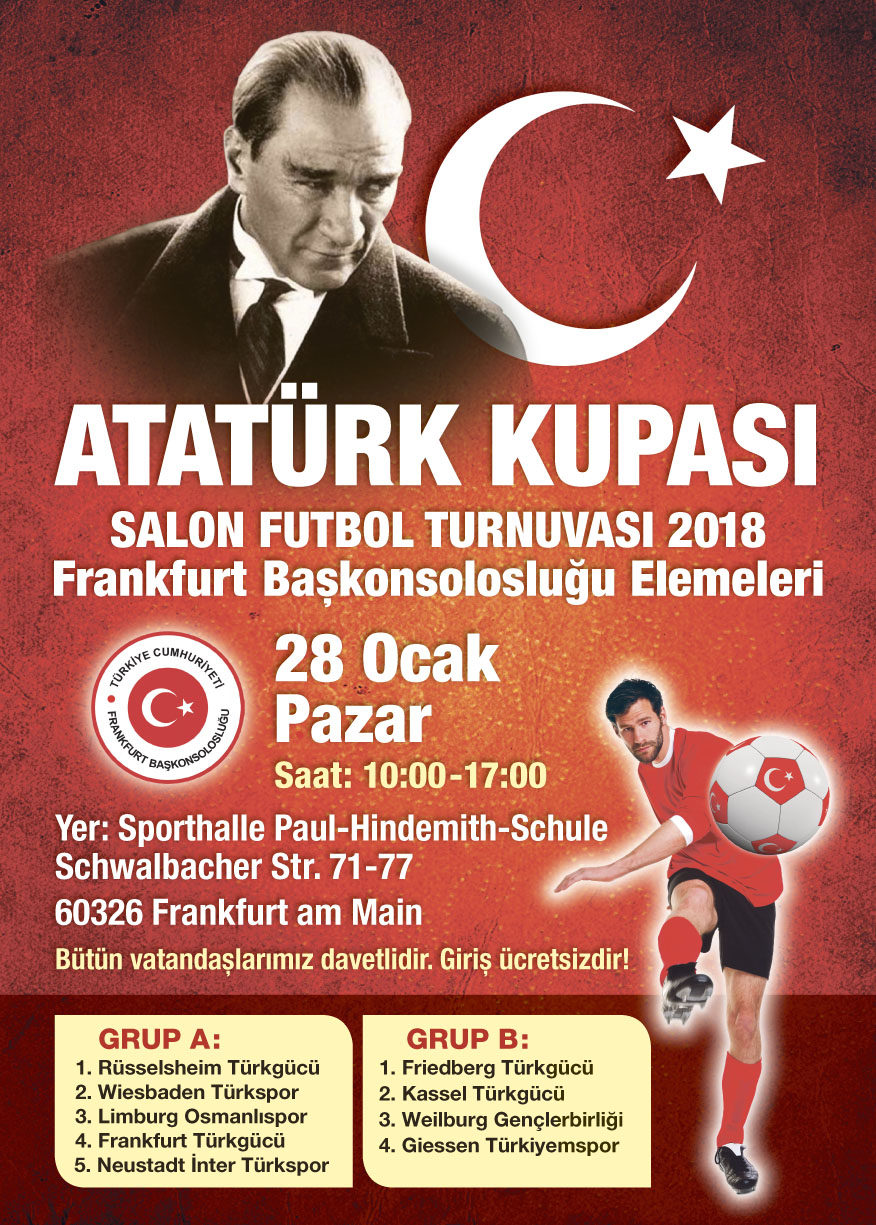 Başkonsolosluğumuz görev bölgesini kapsayan ilk turnuva 28 Ocak 2018 Pazar günü, Paul-Hindemith-Schule kapalı spor salonunda (Adres: Schwalbacher Str.71-77, 60326 Frankfurt am Main) saat 10.00’dan itibaren gerçekleştirilecektir.