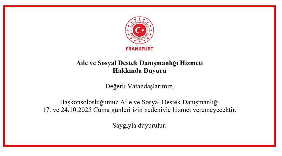 Başkonsolosluğumuz Aile ve Sosyal Destek Danışmanlığı 17. ve 24.10.2025 Cuma günleri izin nedeniyle hizmet veremeyecektir.