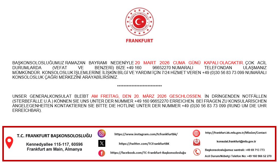 BAŞKONSOLOSLUĞUMUZRAMAZAN BAYRAMI NEDENİYLE20 MART2026 CUMA GÜNÜ KAPALIOLACAKTIR.ÇOK ACİL DURUMLARDA (VEFAT VE BENZERİ)BİZE+49160 96652270NUMARALI TELEFONDAN ULAŞMANIZ MÜMKÜNDÜR.KONSOLOSLUK İŞLEMLERİNE İLİŞKİN BİLGİ VE YARDIM İÇİN 7/24 HİZMET VEREN+49 (0)30 56 83 73 099NUMARALI KONSOLOSLUK ÇAĞRI MERKEZİNİ ARAYABİLİRSİNİZ.